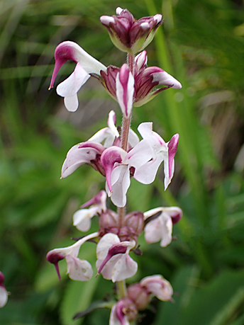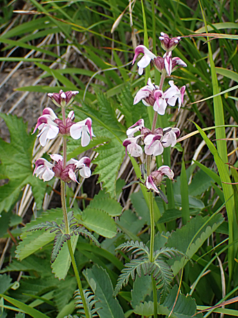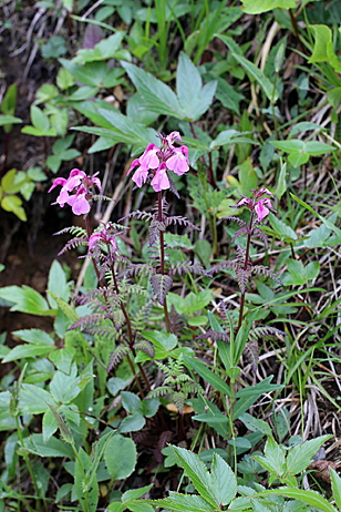 ゴマノハグサ科シオガマギク属 分布 北海道・中部以北 花期 7〜8月 特徴 亜高山帯〜高山帯の礫まじりの草地や岩場に生える多年草。高さ7〜8センチ。地域個体差がおおきい。葉は羽状に深裂し、3〜4個ずつ1〜3段に輪生する。花序は無毛。花は2〜7段つき、花冠の上唇はくちばし状にとがる。 撮影手記 91年、妻と白馬岳へ。山小屋に荷を置き、カメラと三脚を持って、頂上へ向かう登山道を離れ、脇道へ。霧も出って来たし、人影もない。不安そうな妻をよそに、目的の花を見つけて撮影した。一安心して山小屋への帰路、代表的な高山植物のひとつヨツバシオガマを撮影した。 25年、八方尾根。標高の低いところに咲く、薄紅色のヨツバシオガマを撮影した。 左上 1991年7月29日 白馬岳 キャノンF−1 FD100ミリマクロ |