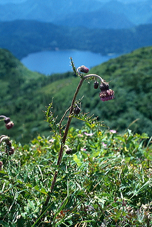 キク科アザミ属 分布 尾瀬周辺・利根川上流 花期 8〜9月 特徴 オニアザミの変種。亜高山から高山帯の草地にはえる多年草。オニアザミと比べて花冠の狭筒部は長さ4〜7ミリで。広筒部より短い。 撮影手記 異常冷夏の年、後平成米騒動が起きる93年の8月、古くからの友人Iさんと尾瀬・燧ヶ岳へ登る。百名山でもあり、東北一の標高を持つ名山である。至仏山と比べて植物層がやや貧弱なのとアプローチが長く、 過去二回ほど燧ヶ岳の登山計画をたてたが、天候悪化のため登山は断念した。 三度目にして登頂をはたしす。登頂の記念に尾瀬沼を背景にジョウシュウオニアザミを撮影した。 左 1993年8月13日 燧ヶ岳 キャノンF−1 FD50ミリマクロ |