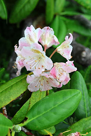 ツツジ科ツツジ属シャクナゲ亜属 分布 北海道・本州中部以北・四国 花期 6〜7月 特徴 山地から高山帯の林内、亜高山帯に多い。常緑低木。高さ1〜3メートルになる。葉は互生し枝先に集まる。葉は長さ6〜18センチ、幅2.5〜6センチの長楕円形。黄緑色でふちに細毛がある。革質で光沢があり、基部は円形。5〜15個の花が枝先に集まってつく。色の変化は多い。花冠は直径3〜6センチの漏斗形で5中裂し、上側の裂片3個には淡黄緑色の斑点がある。雄しべは10個。花糸は白色または淡桃色。基部付近に白毛が密生する。花柱は無毛。子房は有毛。花柄は長さ2,5〜6センチ、微毛がある。 撮影手記 09年、奥秩父の名峰・金峰山に登る。期待していたお花畑はこの山メインを飾る高山植物の時期にはやや早く、少し期待はずれ。下山する時、ハクサンシャクナゲを見つけて撮影。その後、共に登ったサークル仲間の後を追うけれど、追いつかず、かえってバテてしまった。足腰弱くなったと実感。22年、私にとって、ハクサンシャクナゲは高山で良く合う花のひとつだが、なかなか最盛期にで合うことは少なかった。雪の多かったこの年の月山では、ちょうどよい感じのハクサンシャクナゲに出会えることができた。ただ、花の撮影に時間をとられてしまい、山頂には行けなかった。残念。 |