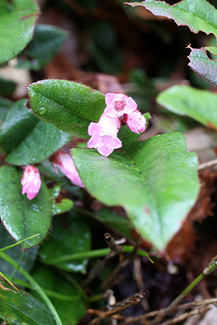 ツツジ科 イワナシ属 分布 北海道(西南部)本州(日本海側) 花期 5〜6月 特徴 果実が梨のような味がすることから。亜高山帯の林縁に生える長さ10〜25センチの常緑の小低木。 茎は地上を這って広がり、赤褐色の粗い長毛が生える。 葉は互生し、卵形で長さ4〜10センチ、幅2〜4センチ。やや革質で先は尖り、縁に粗い毛がある。 花は枝先に総状花序に3〜8個つき、花冠は淡紅色、筒状で長さ約1センチ、先は広がって5裂する。 果実は扁球形、径約1センチ、緑色または赤褐色。 撮影手記 09年、よく利用する夜行の新宿発尾行きのバスツアー、御池行き、乗客はミズバショウの季節というのに、私一人。贅沢な気分。この年の高速料金ETC全線千円割引のため、バスツァーが敬遠されたのかもしれない。御池から裏燧林道を歩くミズバショウの花を見ながら残雪残る道をすべって転びながら行く。樹林下にイワナシの花を見つけて撮影した。 左 2009年5月31日 尾瀬 EOS 40D EF50ミリマクロ |