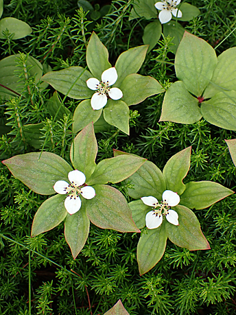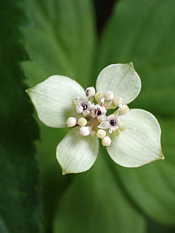 ゴゼンタチバナ ミズキ科ゴゼンタチバナ属 分布 北海道・本州・四国 花期 6〜7月 特徴 亜高山帯の針葉樹林内に生える、高さ5〜15センチの多年草。葉は6個が輪生状につき、倒広卵形で長さ2〜8センチ、先は尖る。花のつかない茎は4個が輪生する。花は1〜3センチの花茎の先に、花弁のように見える4個の白い総苞片が中央に緑白色の小さな花が10〜35個集まってつく。果実は赤熟する。 撮影手記 06年、あこがれの奥会津の田代山へ。車止めより二時間の登り。きつい登りをなぐさめてくれるのが、ゴゼンタチバナであった。 19年、八幡平を歩く。尾根道の上り下りは、高山帯と樹林帯が交互する。樹林下には、びっしりゴゼンタチバナが咲いていた。 左 2006年7月23日 田代山 キャノンEOS−1 タムロン90ミリマクロ |