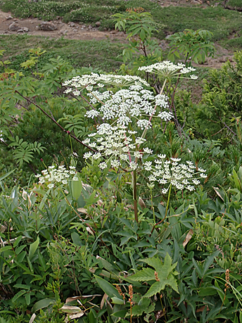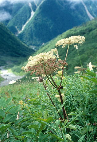 セリ科シシウド属 分布 北海道・本州(東北南部・中部地方) 花期 7〜8月 特徴 亜高山帯の草地に生える草丈50〜150センチの一稔性の多年草。シシウド似ているが、葉が一層広く、小葉は細くて長く、裏面脈上にしか毛はないのが特徴。 茎は上部で枝を分け、無毛。葉は3回羽状複葉で、小葉は長楕円形で長さ6〜15センチ、幅は細く先が尖る。葉柄はふくらんで袋状になる。裏面脈上に毛がある。花は大きな複散形花序となり、白色の小さな花を多数つける。 撮影手記 大型の植物で高山帯・亜高山帯のお花畑ではよく目立ち、ときには群生している。花はまるで花火のような形状である。セリ科の見分けは私は少し苦手だけれども、ミヤマハナウドはすぐにわかる。 左 2012年8月5日 尾瀬ヶ原 キャノンEOS50D EF50ミリマクロ |