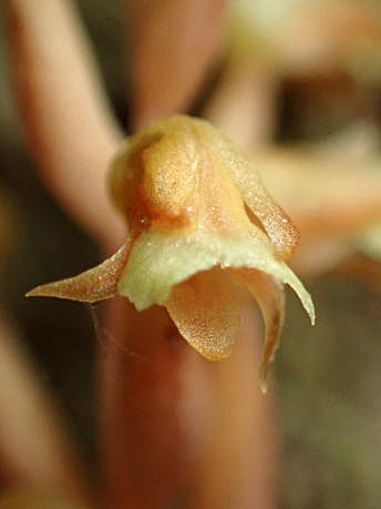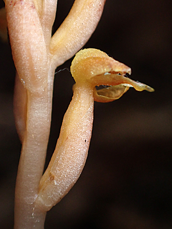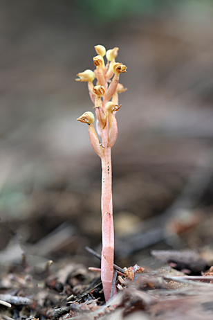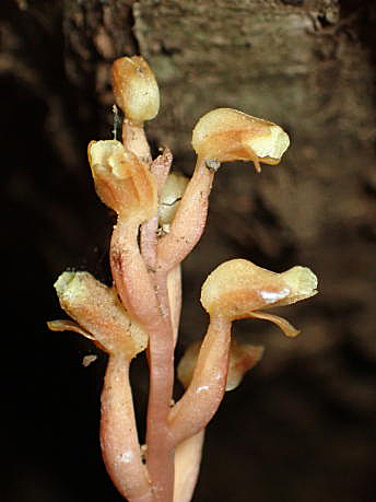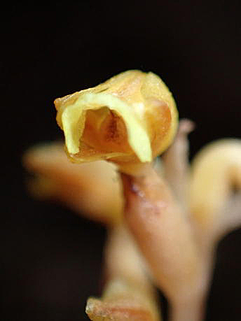 希種 ラン科ヒメノヤガラ属 分布 本州・四国・九州 花期 7月 特徴 常緑広葉樹林の林床に生える、高さ5〜15センチの腐生ラン。全体がサンゴのような紅褐色。花は萼片がくっついているように見える。唇弁は上に付き先がT字に分かれる。 撮影手記 Uさん・Tさんから自生地を教えていただいてから、撮影まで三年もかかってしまった。02年、神奈川のある里山だが、あちらこちらにわき道があり、場所の特定が難しかった。ヤブ蚊の襲来の中、秘密兵器?の電子蚊取り線香も全く効かず。悪戦苦闘しながら紅サンゴの美しい花を撮影した。 25年、花友と丹沢へ。酷暑のなか、自生地に行くまでにバテしまいそう。撮影後早々に下山し駅前の食堂でビールで喉をうるわした。 左 2003年7月6日 神奈川県 キャノンEOS−1 タムロン90ミリマク |