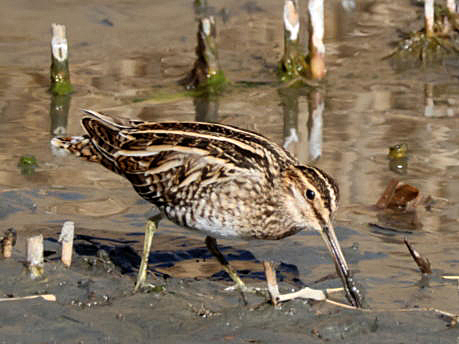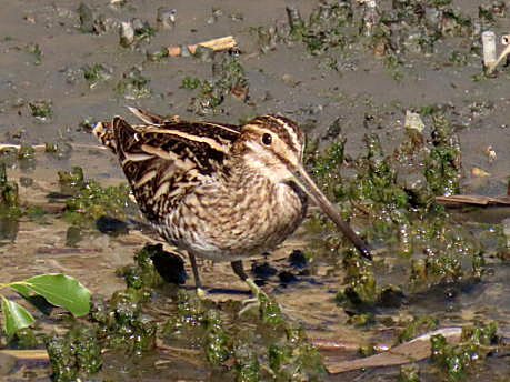 | タシギ 田鶴 ツル目クイナ科 時期 旅鳥 環境 水田・湿地・河原・池や沼の湿地帯・干潟 撮影手記 東京港野鳥公園・第二観察小屋、レンジャーの人からタシギが遠くのアシ原にいると教えていただいた。ミラーレス一眼の望遠では届かず、ニコンクールピクスのデジタルズームで撮影したが作品にはならず。遠すぎた。数週間後、同じ観察小屋。二羽が近くのアシ原近くまでやってきていて、やっと撮影することができた。 |