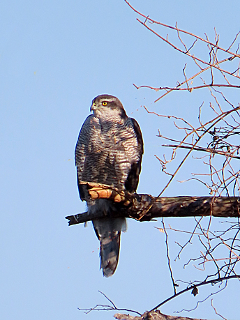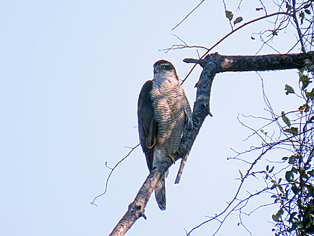 | オオタカ 大鷹 タカ目タカ科 時期 留鳥 環境 平地から山地の林・河川・農耕地・湖沼 撮影手記 24年2月雨上がりの東京港野鳥公園。ルリビタキ メスの撮影などし、帰る間際に第四観察場へ。カワセミがいるかなと思い窓から見ると、アオジがきた。撮影していると、一人のカメラマンが望遠レンズつけた一眼レフで遠くを撮影している。たわむれに、ニコンコンデジで見ると、なんとタカらしいのが見えた。かなり遠く、光学ズーム一杯の1400ミリ相当で撮影。その時は、撮影した人と話し、タカの種類はわからず。 帰宅前に受付にいたボランティアの人に聞く。オオタカで間違いないと、教えていただいた。 その後、東京港野鳥公園において、見る機会は多かったけれど、いずれも遠く、コンデジの最大倍率では、足りずデジタルズームを最大にして撮影。25年の暮れ。やっと、少しは近い木の枝にとまり、撮影することができた。 25年、東京港野鳥公園。二号観察小屋で対岸の木にとまるオオタカを撮影することができた。偶然背景に飛行機が飛び込み、昨年ミサゴ時同様、鷹とジェット機を撮影することが出来た。 |
